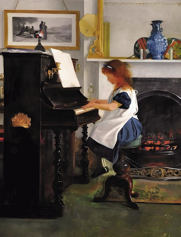 Henry Stacy Marks, c. 1850, Colección particular Felipe Barandiarán En la quietud de esta cálida y acogedora estancia, donde el tiempo parece haberse detenido, una niña de cabellos rojizos esboza unas notas al piano. Su cabeza está ligeramente inclinada hacia las teclas. Su postura denota entrega y paciencia. Lleva un vestido azul profundo, sencillo y encantador, protegido con un almidonado baby blanco. La altura del robusto taburete giratorio, de madera oscura, sobre el que está sentada hace que sus pies cuelguen graciosamente en el aire. Este detalle acentúa la fragilidad de su edad y realza la costosa tarea que enfrenta: aprender a tocar un instrumento que, por su propio tamaño y seriedad, se impone. Por una ventana, que no vemos, entra la difusa luz de un día nublado. Sobre la chimenea, donde crepita el fuego, un gran espejo da amplitud a la sala. Delante, un jarrón azul, unos abanicos chinos y dos candeleros aportan una nota de colorido. Sobre el brillante piano de estudio, unos papeles, un libro y un discreto jarrón con unas florecillas del jardín. Al fondo, sobre la pared, en un sencillo marco con paspartú, una lámina* apaisada con la escena de san Francisco, gravemente enfermo y ciego, llevado en parihuela por otros hermanos, bendiciendo la ciudad de Asís que se divisa en la lejanía. En este cuadro, Henry Stacy Marks inmortaliza no solo a una niña al piano, sino la esencia de la dedicación infantil, la belleza de la música naciente y el universo íntimo de un momento cotidiano. Aquí, la quietud es música y la luz, pintura, mientras la niña, ajena al observador —como Francisco en su lámina contemplando Asís— teje su pequeño milagro sonoro en la eternidad del lienzo.