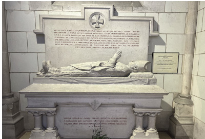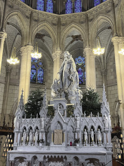 Nuestra Señora, “Libertadora y Puerta del Cielo” El título con el que se venera a María Santísima en Montligeon expresa su misión maternal: Nuestra Señora Libertadora de las Almas del Purgatorio, también llamada en la inscripción del altar mayor de la basílica: Notre-Dame Libératrice et Porte du Ciel (Nuestra Señora Libertadora y Puerta del Cielo). La escultura mariana que domina el santuario es profundamente simbólica. Representa a la Virgen María descendiendo al Purgatorio, inclinándose con ternura sobre las almas que sufren. Su mirada es de compasión, y de sus manos parte el gesto maternal de liberación, sacando del fuego purificador a los fieles que ya se encuentran preparados para el encuentro definitivo con Dios. Al mismo tiempo, la imagen la muestra conduciendo a dichas almas al Cielo, verdadera “Puerta” por la que se accede a la visión beatífica. No se trata de una mera representación artística: es la expresión de la doctrina católica sobre la mediación universal de la Santísima Virgen, enseñada por los Santos Padres y confirmada por el Magisterio. Si Cristo es el único Mediador necesario entre Dios y los hombres (cf. 1 Tim 2, 5), María participa de esta mediación de forma subordinada, pero real y eficaz, como Madre del Redentor y dispensadora de todas las gracias.